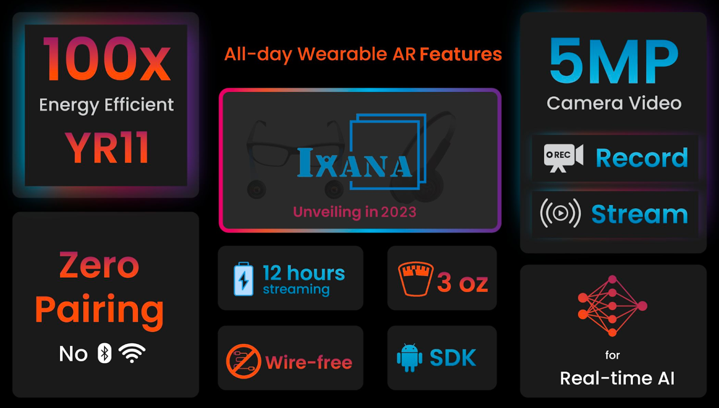 Ixanaは従来の100倍エネルギー効率に優れる独自チップ「YR11」を開発する企業です。「YR11」の省電力、ワイヤレス、リアルタイムAI機能により、ARヘッドセットなどのヒューマン・コンピュータ・インターフェースを強化します。また、当社はリアルタイムAIで過去に出会った人の情報や作業の情報などをリアルタイムに提示することで、使用者に「ウェアラブルブレイン」を提供します。2023年1月5日〜8日まで米ラスベガスで開催されるCESでYR11対応のハードウェアのデモンストレーションを予定しています。