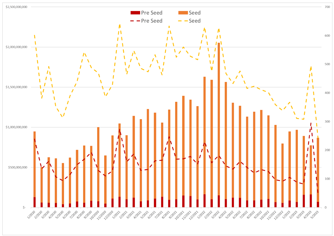 2023年5月のプレシード・シードの投資では、プレシード・シードの投資件数はともに2020年以降で過去最低となりました。投資金額で見ると、シードの投資金額は増加したものの、プレシードの投資金額は今年の2月並みになっています。投資件数に関して増減が激しくなっているので、今後の動向に注意が必要です。