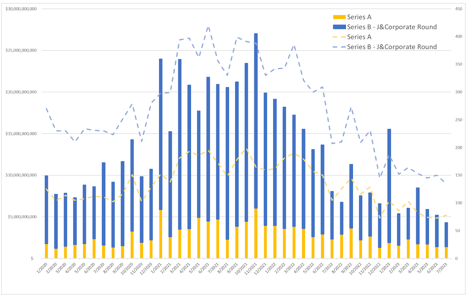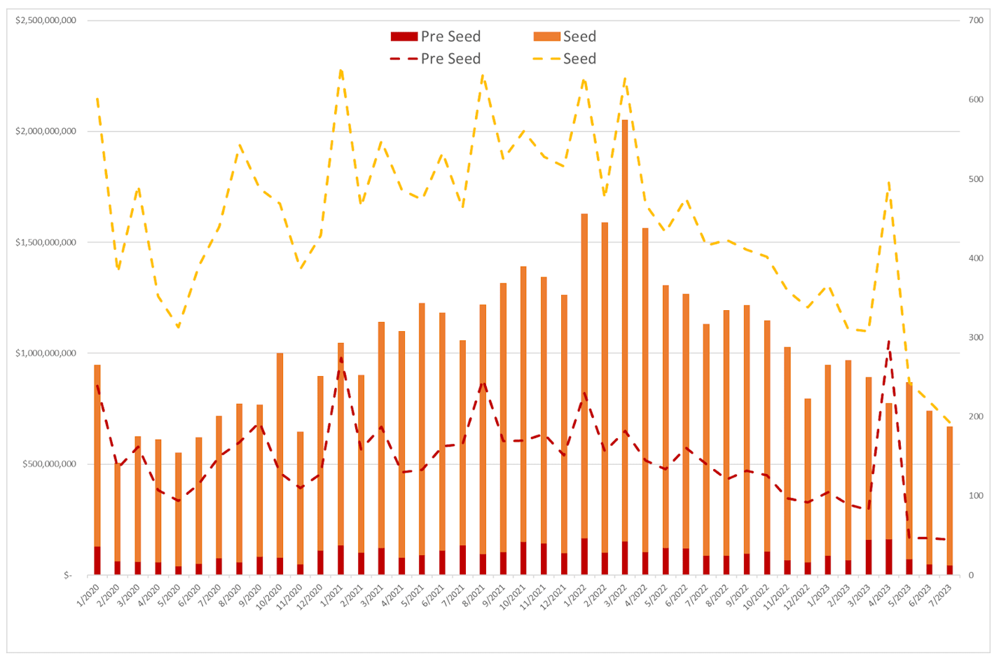 今回のレポートでは、2023年7月のプレシード・シードとシリーズA以降、それぞれの投資動向と注目企業を紹介します。6月のレポートはこちらをご覧ください。 ※2023年5月以降、事業会社からの出資を反映させた集計方法に変更し、各ラウンドにおける投資動向のグラフを変更しています。なお、投資動向のグラフはハードウェア企業・ソフトウェア企業に関係なく米国全体の動向を示しています。