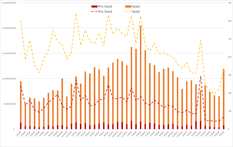 米国全体のプレシード・シードの投資動向(棒グラフ:投資額、折れ線グラフ:投資件数)