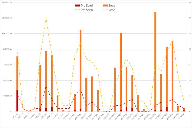 日ごとのシリーズA以降の投資動向(棒グラフ:投資額、折れ線グラフ:投資件数)