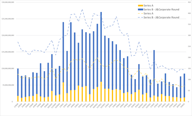 今回のMonozukuri Ventures(以下「MZV」)レポートでは、2023年9月のプレシード・シードとシリーズA以降、それぞれの投資動向と注目企業を紹介します。 8月のレポートはこちらをご覧ください。 ※2023年5月以降、事業会社からの出資を反映させた集計方法に変更し、各ラウンドにおける投資動向のグラフを変更しています。なお、投資動向のグラフはハードウェア企業・ソフトウェア企業に関係なく米国全体の動向を示しています。