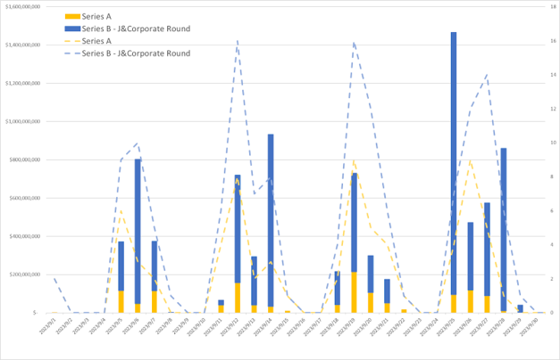 【米国VC投資額レポート: 2023年8月】シードおよびシリーズAの投資件数・投資金額ともに最低水準だが、シリーズB以降は大型調達が出始める