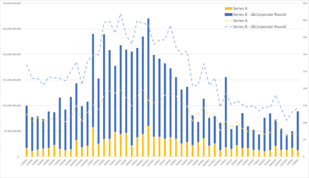 米国全体のシリーズA以降の投資動向(棒グラフ:投資額、折れ線グラフ:投資件数)