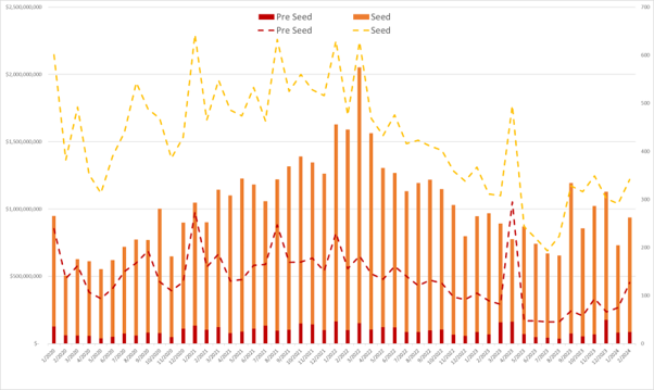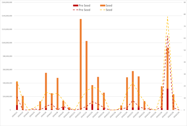 日ごとの米国全体のプレシード・シードの投資動向(棒グラフ:投資額、折れ線グラフ:投資件数)