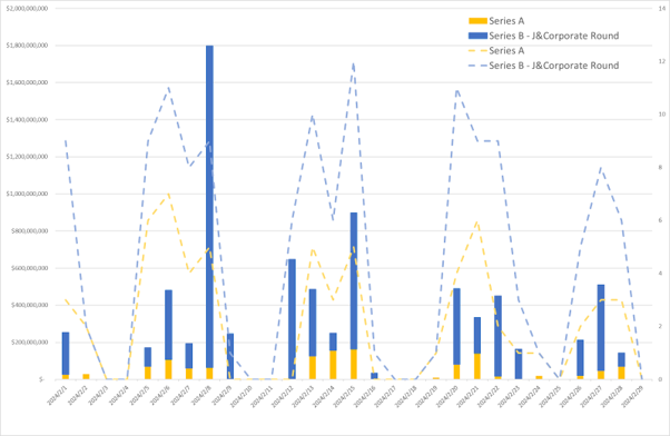 日ごとの米国全体のシリーズA以降の投資動向(棒グラフ:投資額、折れ線グラフ:投資件数)