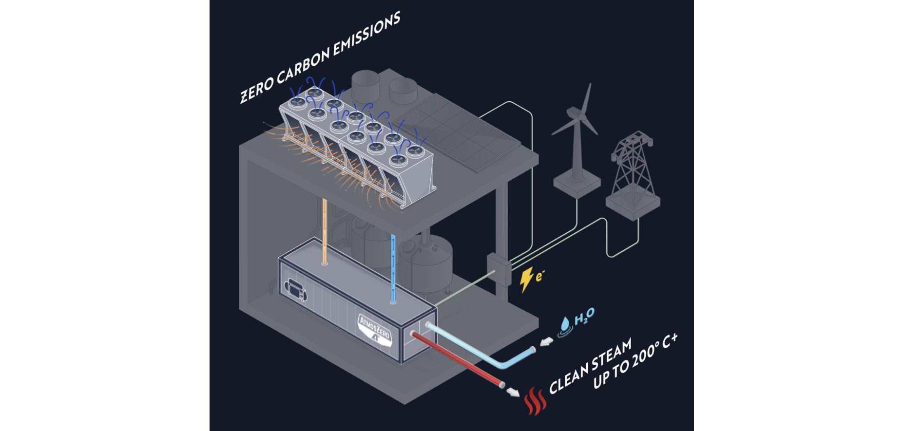 AtmosZeroは、空気中にすでに存在する熱を脱炭素蒸気に変換するモジュール式の電気ボイラーを開発する会社です。独自技術で空気から熱を取り出し、摂氏200度以上のカーボンニュートラル蒸気を提供します。電力1kWhごとに最大2kWhの蒸気を供給できるため、現在の電気ボイラーの半分の電力で2倍の効率を実現しています。