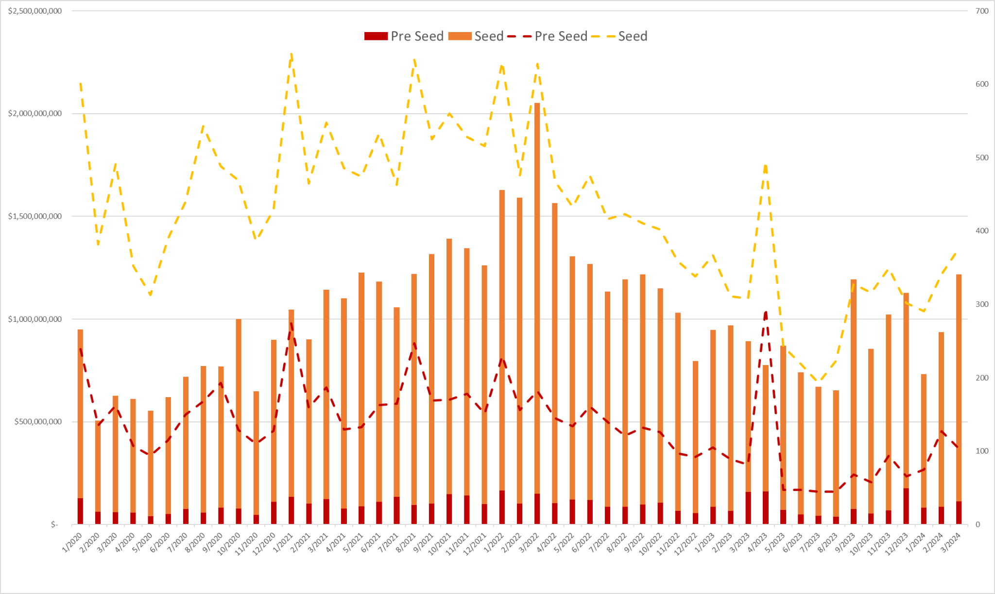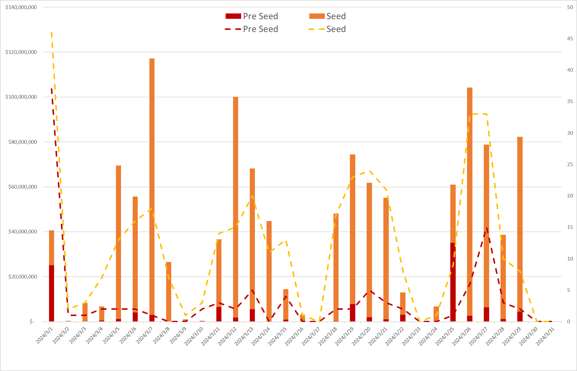 日ごとの米国全体のプレシード・シードの投資動向(棒グラフ:投資額、折れ線グラフ:投資件数)
