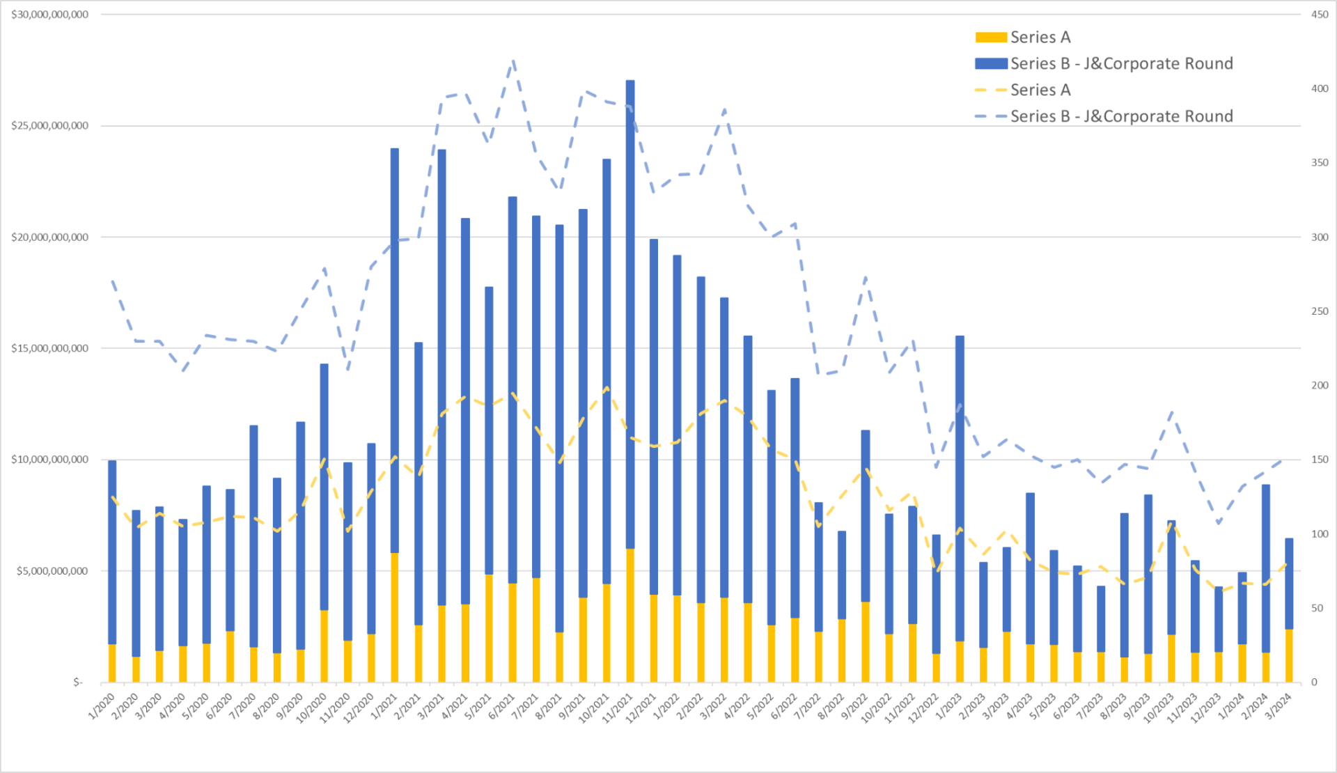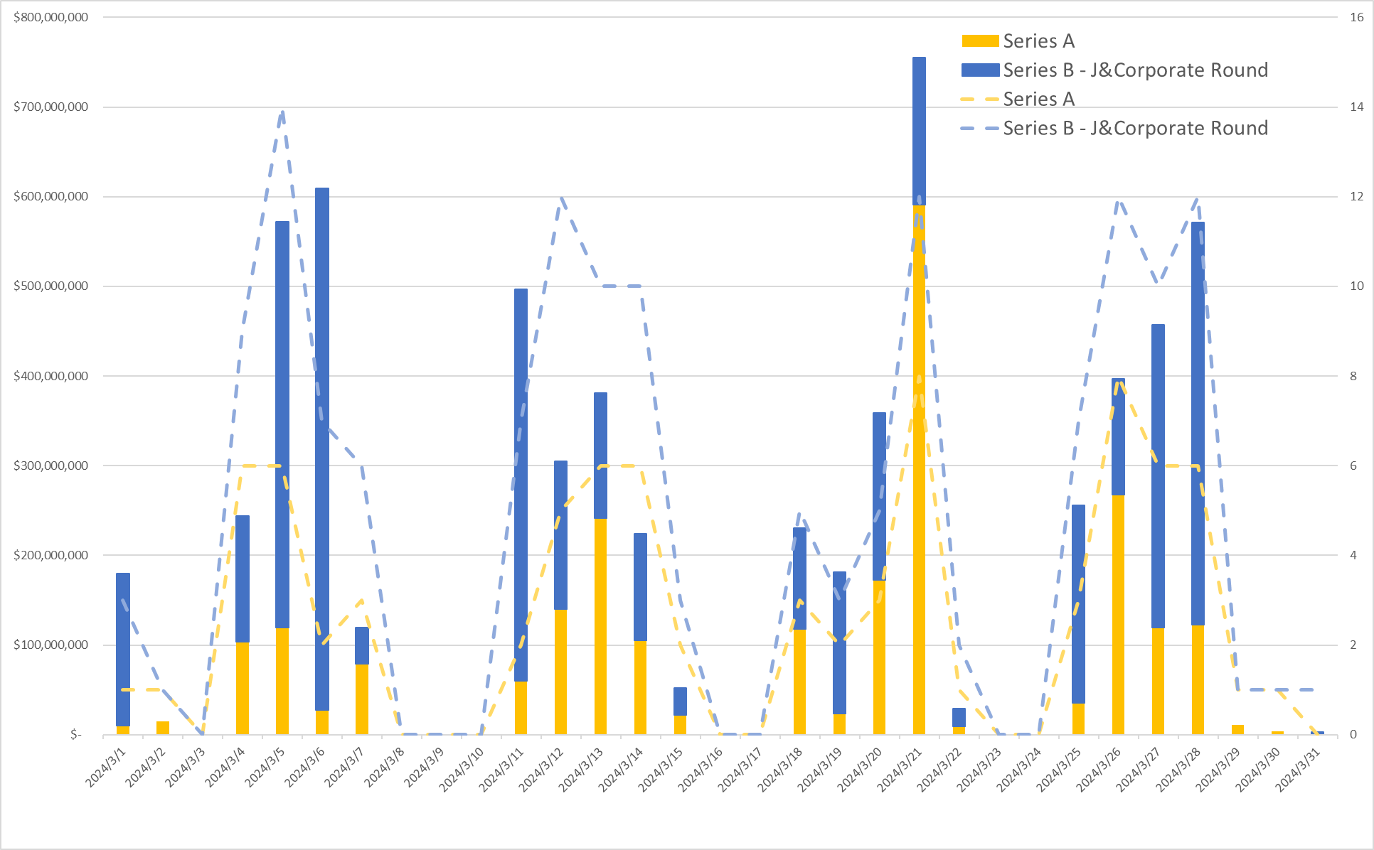 日ごとの米国全体のシリーズA以降の投資動向(棒グラフ:投資額、折れ線グラフ:投資件数)