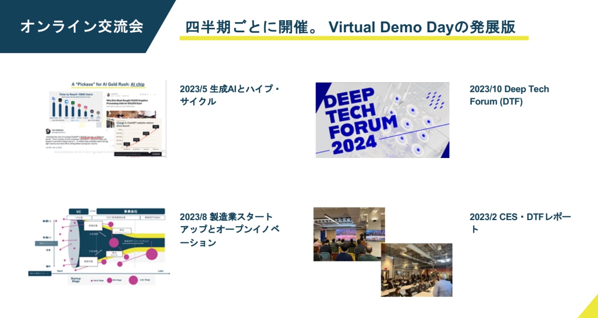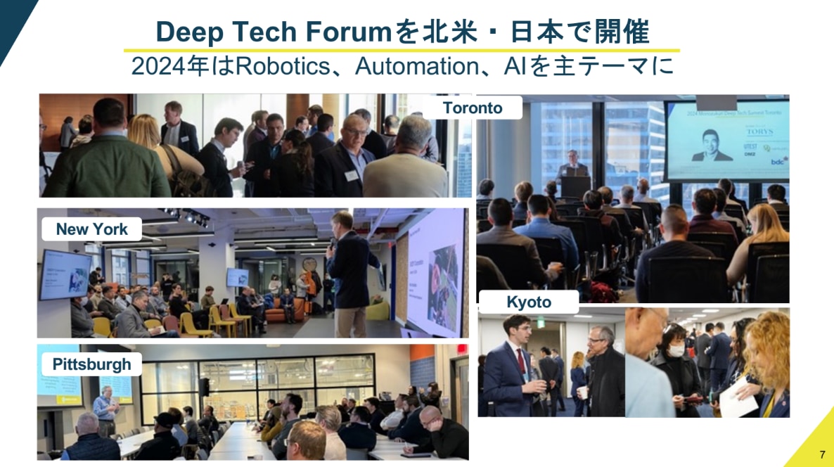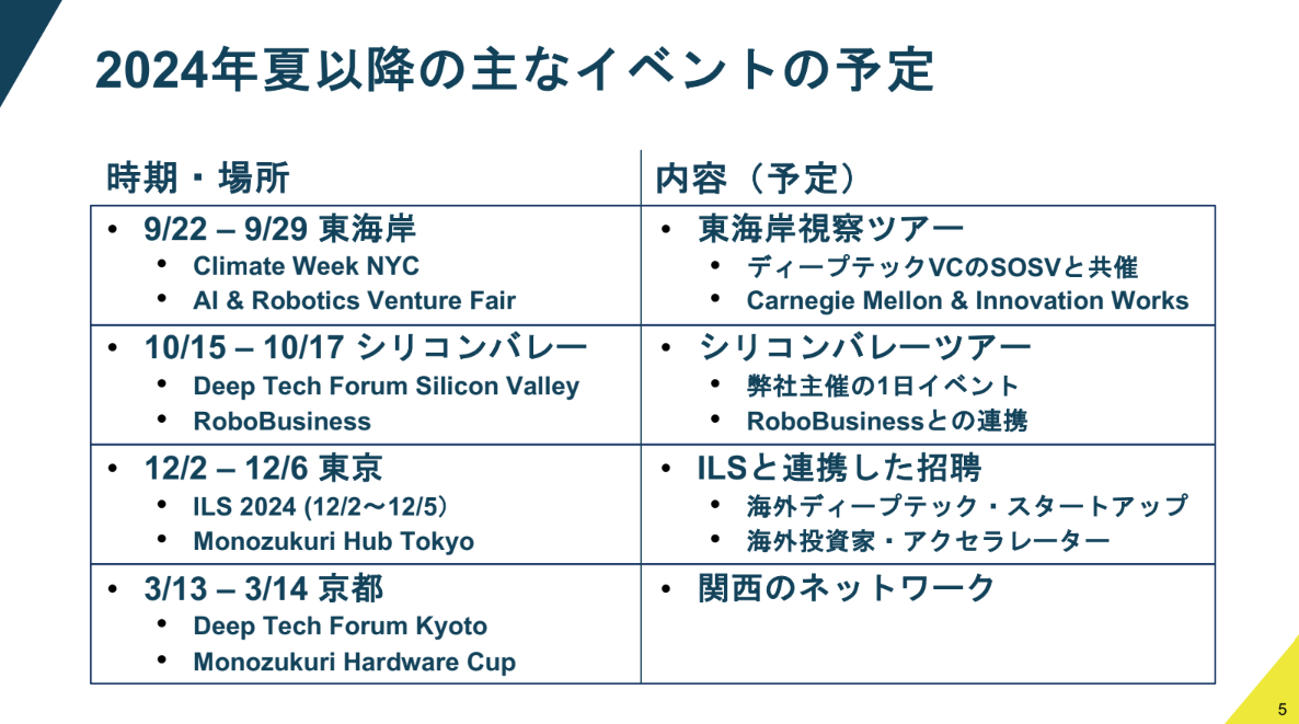 2024年の夏以降、以下のようなイベントを予定しています。 9月 9月22日〜29日: アメリカ東海岸で開催される「Climate Week NYC」と「AI & Robotics Venture Fair」にあわせて、視察ツアーを実施予定です。 10月 10月15日〜17日: シリコンバレーで「Deep Tech Forum」を開催します。10月15日にフォーラムを行い、16日と17日には「RoboBusiness」との連携イベントを予定しています。 このイベントは、5月にボストンで開催された「Robotics Summit & Expo」の主催者が西海岸で開催するものです。 12月 12月2日〜5日: 東京の虎ノ門で「イノベーション リーダーズ サミット (ILS)」が開催されます。現在、このイベントの翌日にミートアップを予定していますが、詳細はまだ調整中です。ILS期間中や前後に開催する可能性もあります。主に海外のスタートアップや投資家、アクセラレーターを招待し、東京での交流を促進します。 2025年3月 2025年3月13日〜14日: 京都で「Deep Tech Forum Kyoto」を開催します。今年と同様に「Monozukuri Hardware Cup」も同時に実施します。関西のネットワークを活用してイベントを展開する予定です。 これらのイベントを通じて、スタートアップと投資家、大企業との交流を深め、協業の機会を創出していきます。