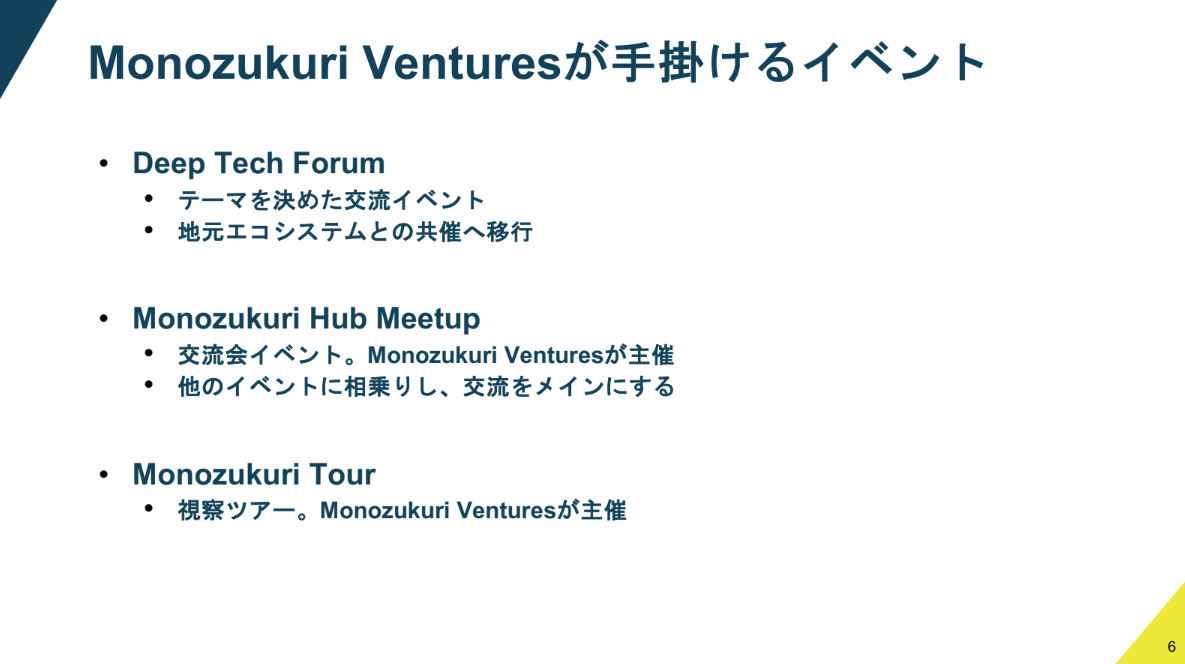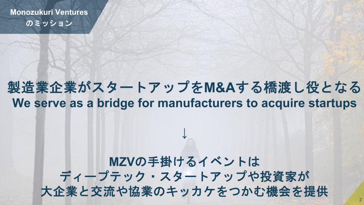Monozukuri Venturesのミッションは、製造業企業がスタートアップをM&Aする橋渡し役になることです。特に過去3年間で、この役割を強化してきました。 我々は投資活動だけでなく、様々なイベントやワークショップも行っています。これらの活動は、ディープテックスタートアップと投資家が大企業と頻繁に交流できる場を提供し、協業や出資の機会を増やすことを目的としています。 最終的には、スタートアップを巻き込んだ形でのオープンイノベーションの実現を目指しています。