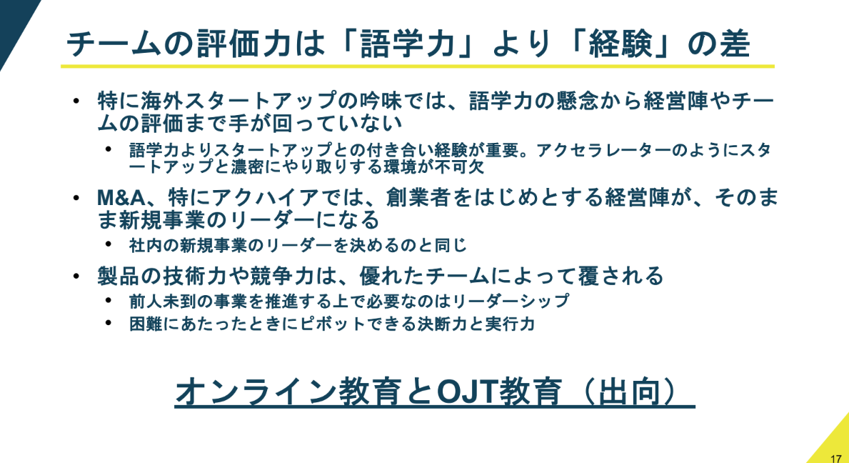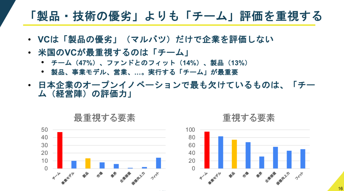 事業部門の評価方法 事業部門はスタートアップを評価する際、技術や製品の優劣に焦点を当てます。同じ業種の複数のスタートアップを比較し、製品の品質を○×の表で評価することが一般的です。 VCの評価方法 一方、プロフェッショナルVCは特にチーム、特にマネジメントチームや経営陣を重視します。シカゴ大学の調査によると、VCの約47%がチームを最重要視し、製品やビジネスモデルは10%以下に留まります。つまり、VCはチームの質を最も重視します。 日本企業の課題 日本企業がオープンイノベーションを実践する際、製品や事業モデル、市場については詳しく調べますが、チームの評価は軽視されがちです。この点がVCとの大きな違いです。 チーム評価の重要性 チーム評価には、語学力や親密さだけでなく、個々の能力やチームワークが発揮できる構成が重要です。特に海外では、チームが適切に構成されていないケースも多く見られます。 課題の克服 スタートアップへの投資や買収を行う際、文化や語学の違いを超えて、適切な評価を行うためには実践と経験が必要です。具体的には、質の高いミーティングを通じてチームワークや経営陣を評価し、質問力を高めることが重要です。 ミーティングの重要性 ミーティングでは、スタートアップが一方的にピッチすることが多く、効果的な質問が難しい場合があります。これを克服するために、質問力を向上させるトレーニングが必要です。 今後も、これらの課題を克服し、スタートアップとの連携を深めるためのサポートを提供していきます。