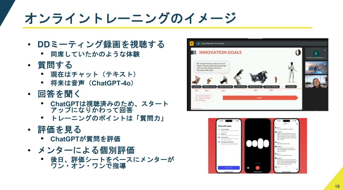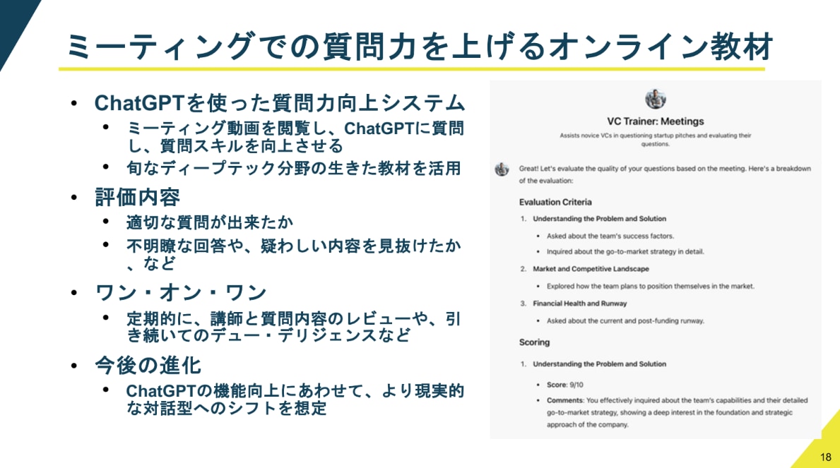 これは実際にミーティングに参加するのではなく、時間差で利用可能です。 まず、ChatGPTにミーティングを見せ、その後に質問を行います。事前にミーティングの内容をChatGPTに読み込ませておくことで、私たちの質問に対して資料やミーティング中の情報をもとに回答してくれます。そして、その回答に対してさらに質問を繰り返すことで、質問力を実践的に鍛えます。 現在、ChatGPTはチャット形式でのみ対応していますが、最新のChatGPT-4oでは音声でのやり取りも可能です。この機能が利用できるようになれば、口頭で質問し、音声で回答を得ることができます。一定の時間内で練習を終えるように設定し、重要なのは、10分から15分のプレゼンテーションを聞いた後に的確な質問ができるかどうかです。 プレゼンが終わった後に質問の質を評価し、必要に応じて人間が評価を行うことで、どんな質問をすべきかを教育することを目指しています。このような方法で、効果的に質問力を鍛えることができます。