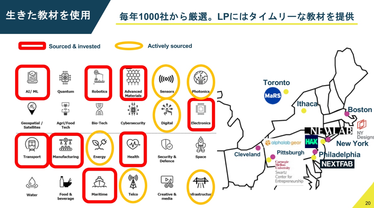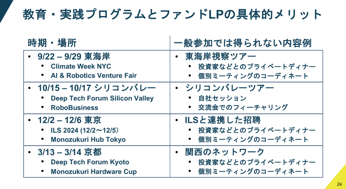 具体的には、秋以降のイベントについても、例えば東海岸で開催されるClimate Week NYCやAI & Robotics Venture Fairに参加する際に、ツアーではイベントのDemo Dayや出展者ブースに参加するだけですが、実践プログラムに参加するLPの方々には、プライベートなディナー兼交流会や、事前に打ち合わせをしておいた投資家との個別ミーティングのコーディネートなどを提供します。また、シリコンバレーのDeep Tech Forumでは、優先的にセッションを持つ機会も提供します。 我々は、2号ファンドの途中からオープンイノベーションに関連する教育が課題だと認識しており、現地駐在の方々からは実践が課題だという声も伺っています。これを踏まえ、この1年間のイベントや視察ツアーでのフィードバックを基に、教育と実践のプログラムを開発しています。 まだ具体的な提供方法は決まっていませんが、内容や提供時期、形態、価格について関心がある方は、ぜひ個別にお問い合わせください。詳細をご説明いたします。