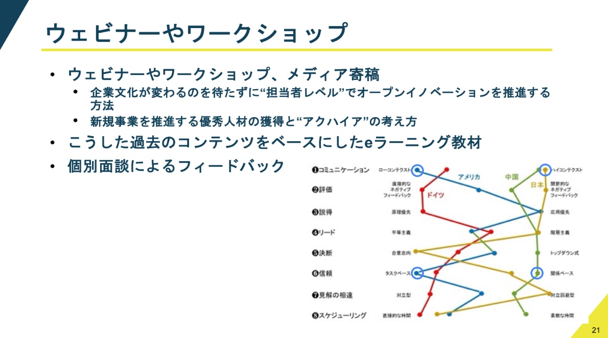 ウェビナーやワークショップについては、既にJETROさんと協力し、自社でもオープンイノベーションに関するセミナーやウェビナーを開催しています。さらに、今後は書籍も出版予定です。これらを基に、セミナー、読み物、eラーニング、そして場合によっては個別面談などを通じて、インタビューの質問力だけでなく、その活用方法についても教育していきたいと考えています。
