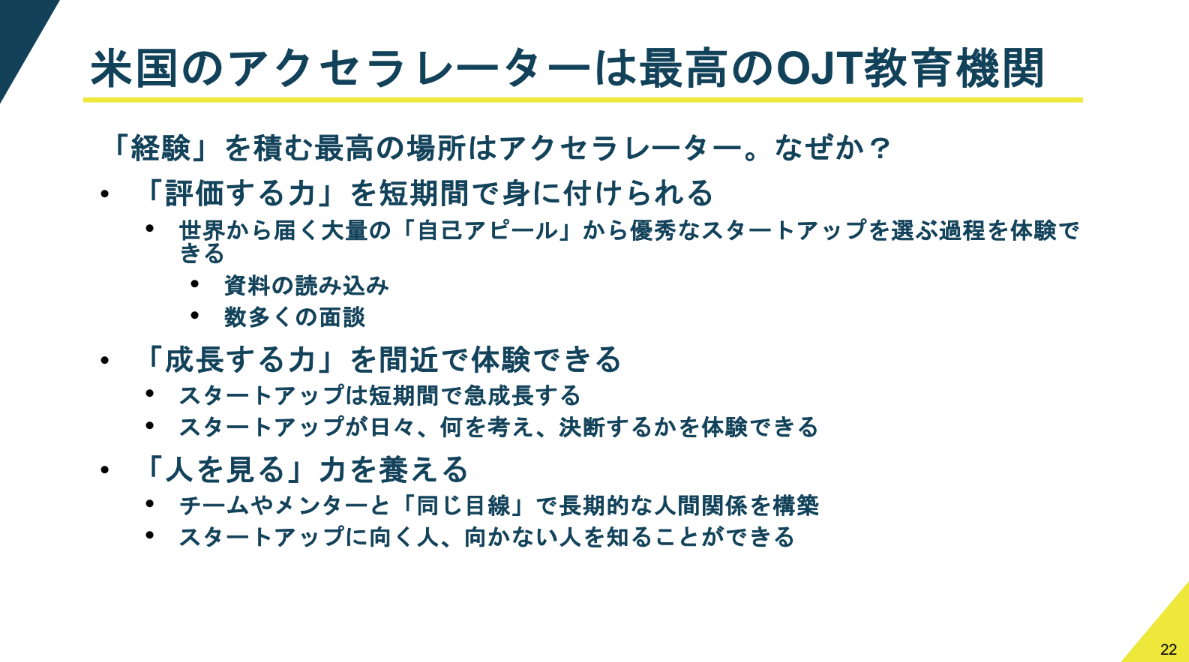 アメリカのアクセラレーターはOJT(オン・ザ・ジョブ・トレーニング)の教育機関として、最適な場所だと考えています。これは、世界中から大量のスタートアップのアプリケーションが届き、それをスクリーニングし、必要に応じてインタビューを行うことで、優れたスタートアップを見抜く実践力が養われるためです。 短期間で大量の資料を読み込み、多くの面談をこなすことでOJTが実現します。しかし、それだけではなく、より重要なのは、アクセラレーターに参加したスタートアップと日々時間を共有することです。毎日ではなくても、週に定期的に会い、特に重要な決断の場面でのメンタリングを行うことで、スタートアップの急成長を間近で体験することができます。 例えば、半年間のアクセラレータープログラムでスタートアップがどれだけ変わるかを観察することは、非常に大きな経験となります。その中で、人を見る目を養うことができます。よくあるのは、ファウンダー同士の対立や方針の違いによる離脱です。これをどのように防ぐか、一緒に考えることで、成功するスタートアップの共通項を見つけることができます。 このような体験が、12ヶ月という短期間で凝縮して得られることが、アメリカのアクセラレーターが最高の受入れ機関である理由です。我々はこのような教育実践プログラムを提供する予定です。