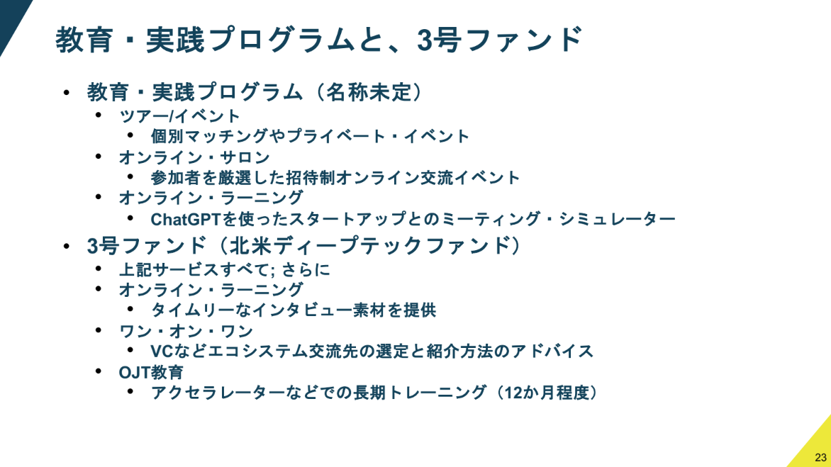 もともと、このプログラムは3号ファンドのLP(出資者)の方向けのサービスとして考えていました。しかし、内容が多岐にわたること、そしてピュアなリターンを求める出資者と、教育プログラムを希望する出資者の間に意見の違いがある可能性があるため、教育実践に特化したプログラムはファンドとは別に分けることにしました。 具体的には、教育実践プログラムではオンラインラーニングだけでなく、実践の場としてツアーやイベントで個別のVC(ベンチャーキャピタル)とマッチングを行う、プライベートの招待制イベントを開催する、といった活動を予定しています。これはリアルな場だけでなく、オンラインでもサロン形式の交流イベントを行い、広くVCと知り合う機会を提供します。 ただし、ファンドの出資がなければ実現できないものもあり、これらはファンドのLP向けに提供する予定です。具体的には、オンラインラーニングでスタートアップのプレゼンテーションを見て質問する場面で、タイムリーなインタビュー素材を提供する、あるいはアクセラレーターへのOJT派遣を行うなどです。これらは投資先だからこそ可能なプログラムです。 このように、教育実践プログラムとファンドのLP向け実践プログラムをパッケージ化して提供する計画です。