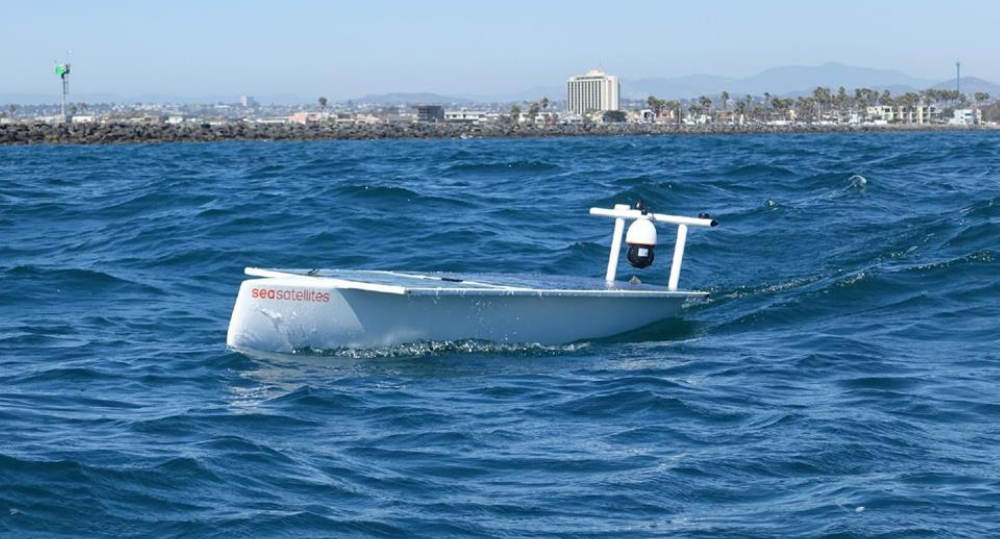 ALT: SeaSats maritime vehicle is sailing on the sea. About narrow and 3 meters long and has a flat top surface with a sensor-like round object at the back.