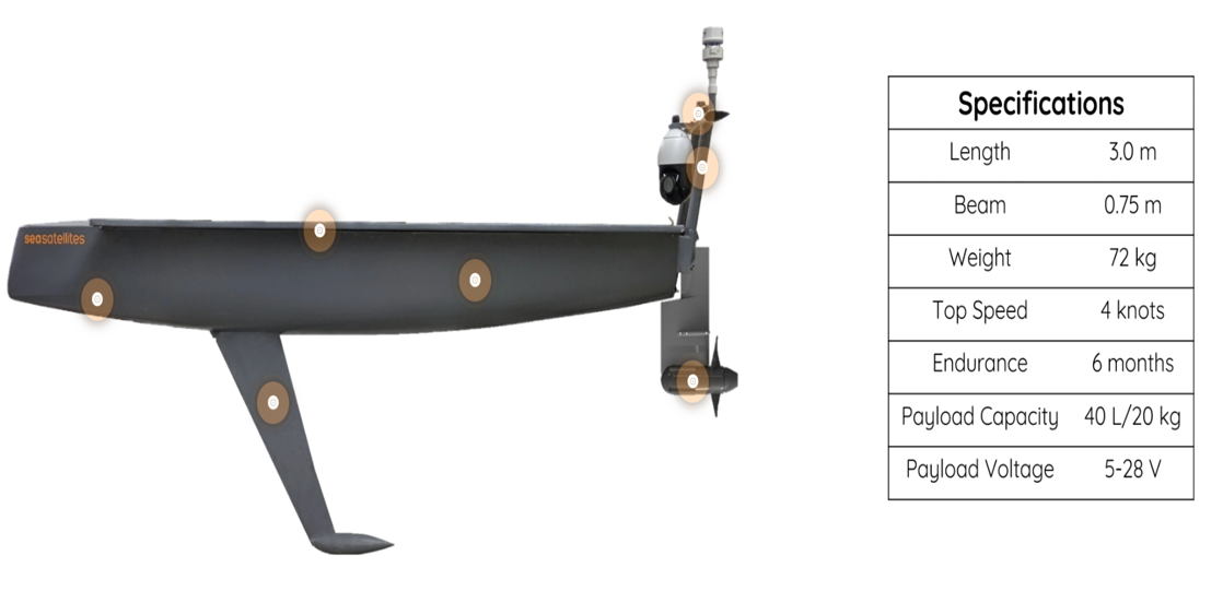 ALT: Side view of SeaSats X3 on the left and its specifications table on the right. Length 3.0m, Beam 0.75m, Weight 72kg, Top Speed 4 knots, Endurance 6 months, Payload Capacity 40L/20kg, Payload Voltage 5-28V